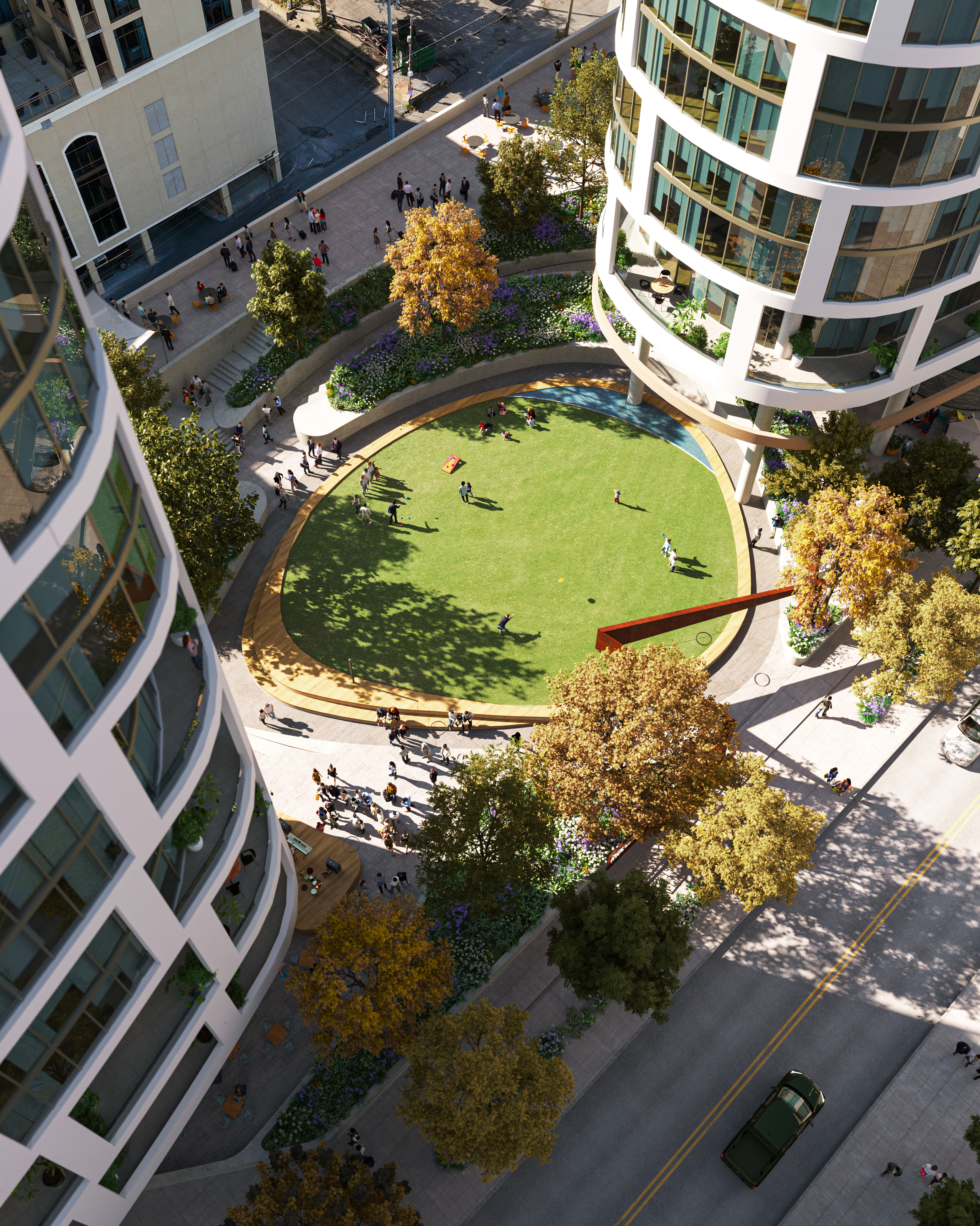 Low impact design measures include urban bioretention and capturing roof and plaza storm runoff for use in the chiller system makeup water. The development also requires relocating overhead electric, significant public waterline expansion and storm infrastructure upgrades on 14th Avenue South, and a dedicated bike lane on McGavock Street.